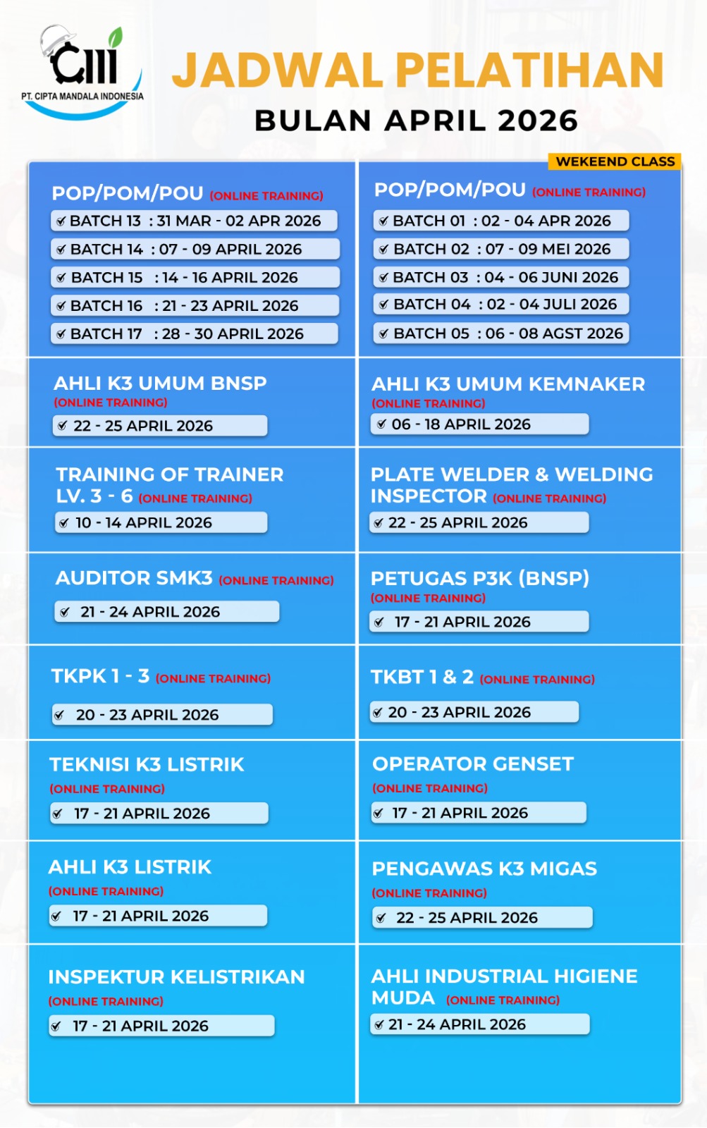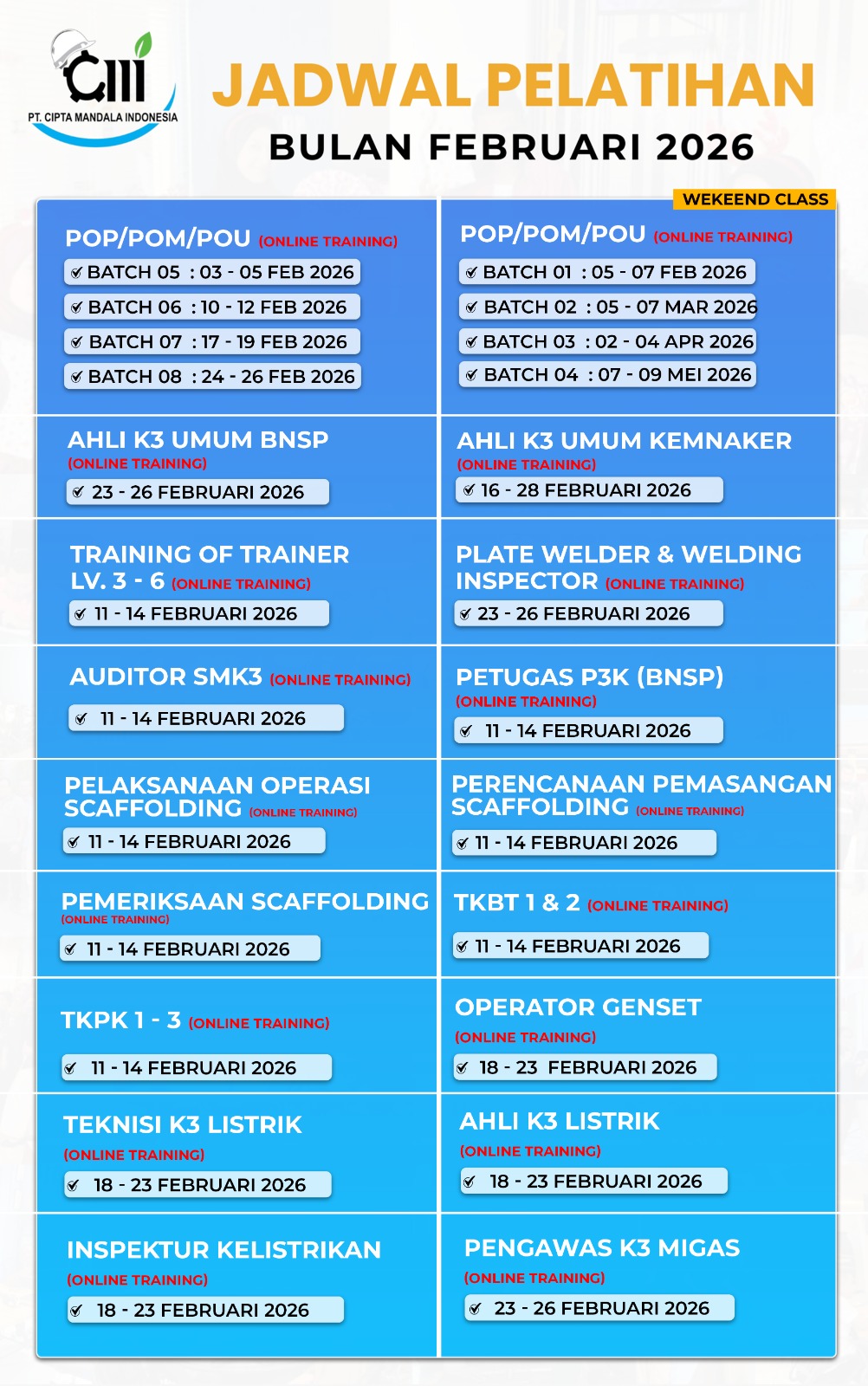 Dalam melaksanakan setiap kegiatan layanan yang akan kami berikan, PT Cipta Mandala Indonesia memberikan jadwal yang dapat di sesuaikan dengan kebutuhan masing – masing pendaftar.